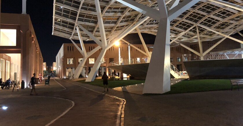 A son arrivée dans la ville nouvelle de Ben Guerir, à mi-chemin entre Casablanca et Marrakech, le visiteur la découvre tout en ocre : un clin d’œil de son architecte, Ricardo Bofill, à la médina de Marrakech… Tous l’appellent la « ville verte », parce qu’elle affiche un objectif de 20 mètres carrés d’espaces verts par habitant, bien plus que les autres métropoles marocaines. Mais aussi et surtout parce que les bâtiments sortis du désert depuis 2012 se veulent résolument durables : Ben Guerir la neuve affiche des objectifs ambitieux d’efficacité énergétique et de frugalité dans l’usage des ressources, en particulier de l’eau.