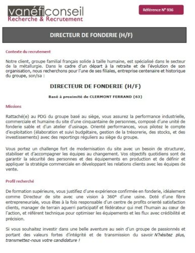 Ci-dessous un exemple avec Fonderie HAMEL qui recherche son adjoint Responsable Production (F/H) et à moyen terme la possibilité de diriger le site de production.