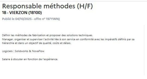 OFFRE EMPLOI : Saint-Gobain SEVA recherche un(e) Technicien(ne) ou un(e) Ingénieur(e) Méthodes expérimenté(e) en #Fonderie acier et superalliages, pour une mission en prestation à partir de maintenant, avec une possibilité d’embauche début 2026.