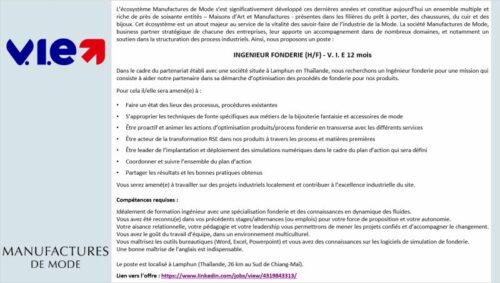 VIE Ingenieur Fonderie en Thaïlande (Bijouterie)