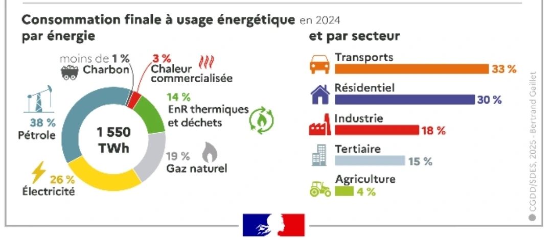La France consomme encore près de 60% d’énergies fossiles (il y a aussi un peu de gaz dans la production d’électricité).