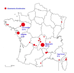 De par sa riche géologie, la France fut aussi un important producteur d’antimoine, et même le premier mondial (30 à 50 % de la production planétaire) entre 1888 et 1914 grâce aux gisements corses de 1888 à 1898 puis au gisement de La Lucette entre 1899 et 1914.