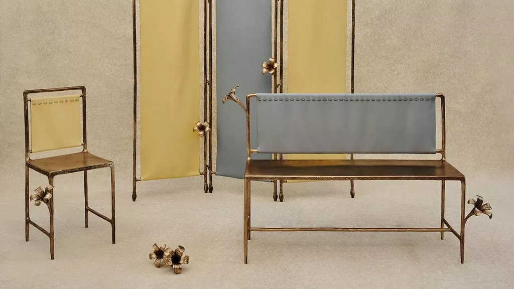 Si Diego Giacometti, frère cadet d’Alberto, a jadis réalisé des meubles-sculptures en bronze peuplés d’animaux poétiques, Constanza Vallese, elle, opte pour le végétal et donc, plus précisément, pour le majestueux lys. Chaque fleur est sculptée en 3D à la main et moulée en bronze massif. Paravent et assises sont, eux, rehaussés de pans de cuir de couleur bleu anis ou jaune sorbet, avec une finition ornée de surpiqûres sellerie, une signature de la maison.